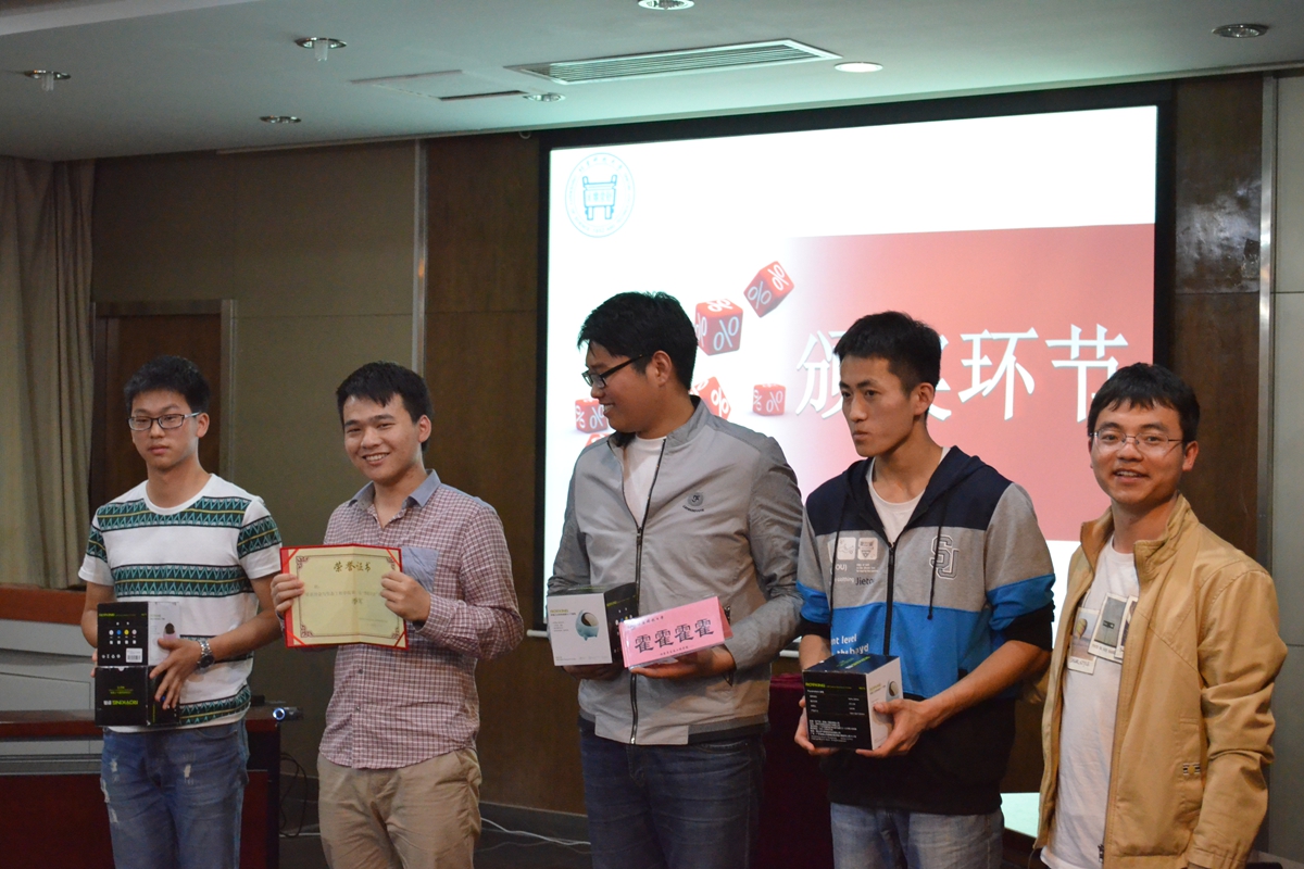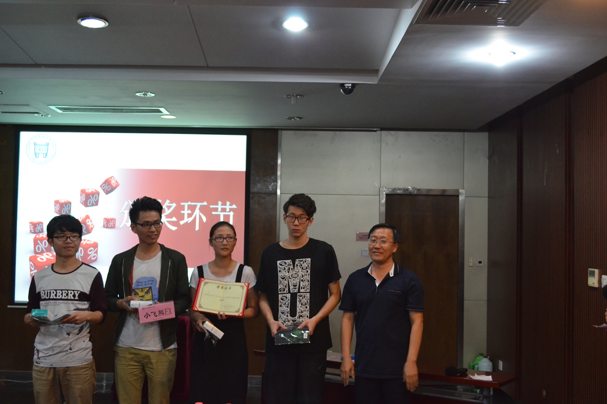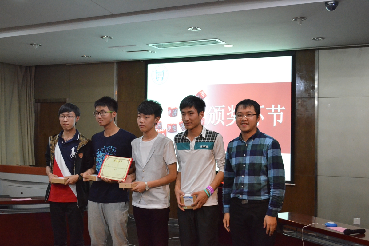 在颁奖环节,谢宏亮同学为“人气之星”团队颁奖;郝勇飞老师为季军团队1306班“霍霍霍霍队”颁奖;杨志伟老师为亚军团队1503班“对不对队”颁奖;王春义老师为冠军团队1406班“小飞熊EX队”颁奖。
