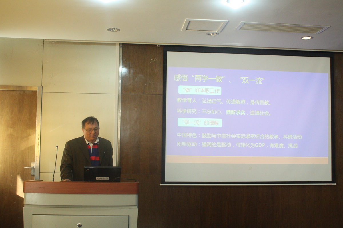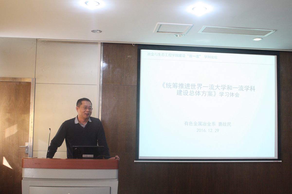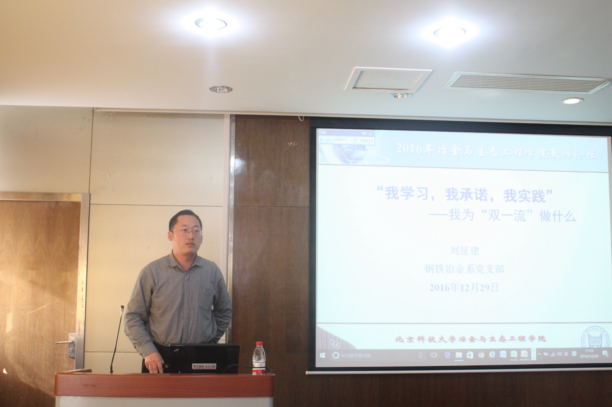 随后,科研教学系列教师代表发言。首先,刘征建老师提出,青年教师应加强自身教学科研素质提高,做好学院教学的“接力”工作,多向经验教师学习,为学院教学工作建设奉献力量。闫柏军老师从冶金物理化学的历史渊源谈到现阶段冶金物理化学学科的发展,同时,对于冶金物理化学前沿所面临的一些挑战提出了自己的建议。曹战民老师指出,为推进世界一流大学和一流学科建设,各位教职工应该多加强自身的理论学习和科学研究。朱荣老师指出,在“两学一做”中,教师要做好自己的教学科研的本职工作,不仅要教学,更要育人。在科研工作中,充分发扬“求实鼎新”的校训精神,做到不忘初心,造福社会。在双一流建设中,要把握中国特色和创新精神,推动我校与国际云顶集团的接轨。刘晓明老师最后指出,办好高校,必须牢牢抓住全面提高人才培养能力的核心点,学院应加强对学生的关心和培养,争取更好的发展。