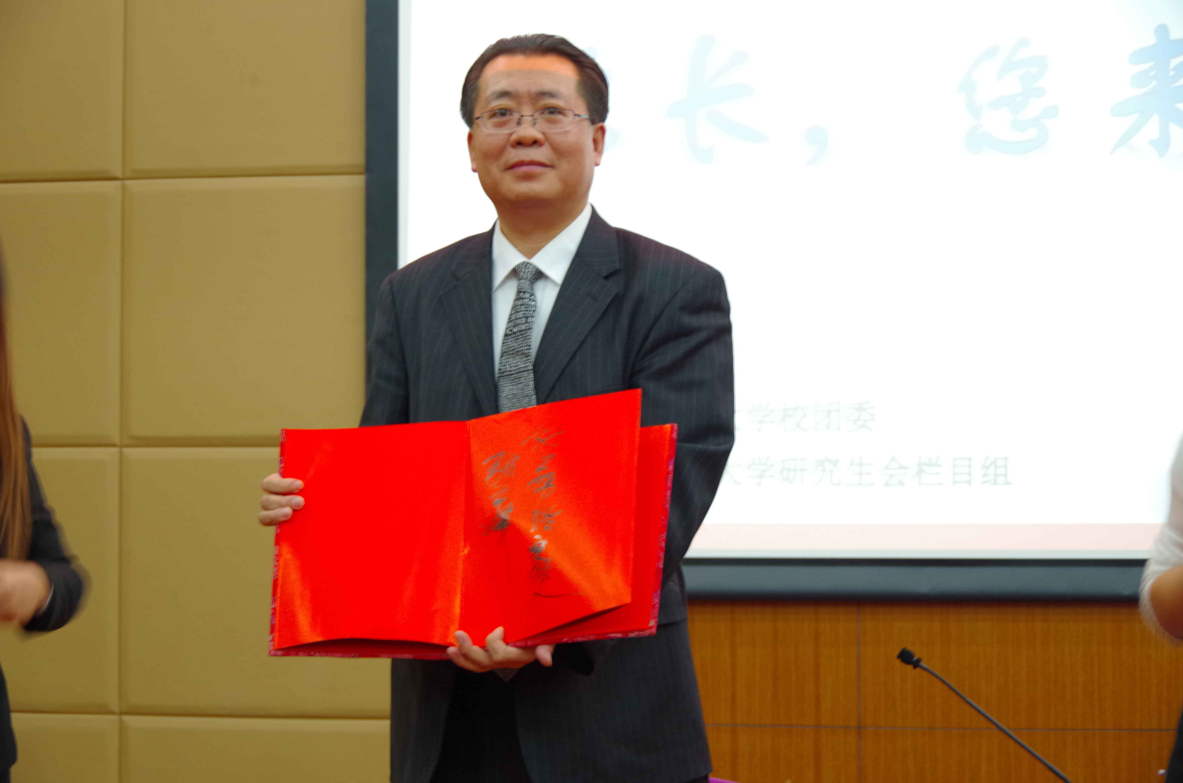 在活动尾声,张院长在签名簿写下赠言,研会主席代表全体学生送上鲜花,校团委副书记王鹂老师作总结讲话并对张院长的到来表示感谢。至此,2016年北京科技大学第十六期学术人生之“院长,您来啦”访谈活动圆满结束。