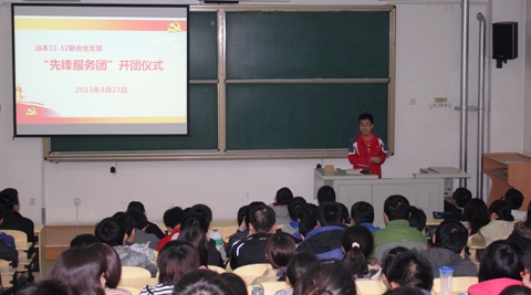 2013年4月23日晚,冶本11-12联合党支部组织生活会及“先锋服务团”开团仪式在冶金楼110顺利举行,冶本11、12级党员、积极分子及部分普通同学参加了此次仪式,王洋、张瑜两位辅导员也出席了会议。