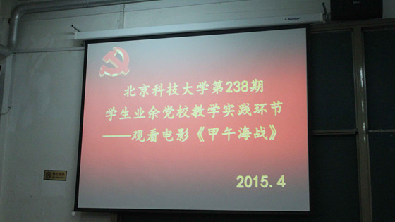 在冶金楼110教室举行北京科技大学第238期学生业余党校教学实践环节。为了纪念抗战75周年,培养大家的爱国精神,党校组织观看电影――《甲午海战》。