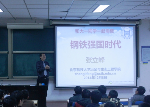 的学院概况、组织架构和师资力量,并通过比较近十年来在《MMTB》、《ISIJ》、《Steel Research》等知名期刊上文章的发表数量向同学们展示了我校在钢铁研究领域取得的优异成绩。他告诉大家:“中国是绝对的钢铁强国,北科是绝对的钢铁强校,学在北科,应该学会充分利用好身边的宝贵资源,提高时间的利用效率。”