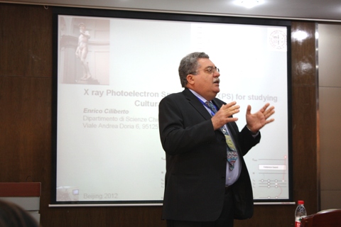 典礼结束后,研习班举办了两场精彩的学术交流讲座。首先是恩里科•奇利贝托教授以“XPS分析技术在文物材质研究上的应用”为题的学术讲座,讲述了多个有关XPS应用案例,为学员们展现过去十年来在考古或艺术史文物(如壁画、石器、玻璃、金属等)表面化学成分上的分析工作,以及对XPS技术在考古和艺术史研究领域的潜力和局限性进行一个简单的探讨,并举例说明不同艺术品的XPS研究情况。最后恩里科•奇利贝托教授在通过XPS技术检测文物修复有效性和破坏性方面,以米开朗基罗的大卫像和威尼斯圣马可大教堂马赛克的修复等为案例进行了批判性的探讨。