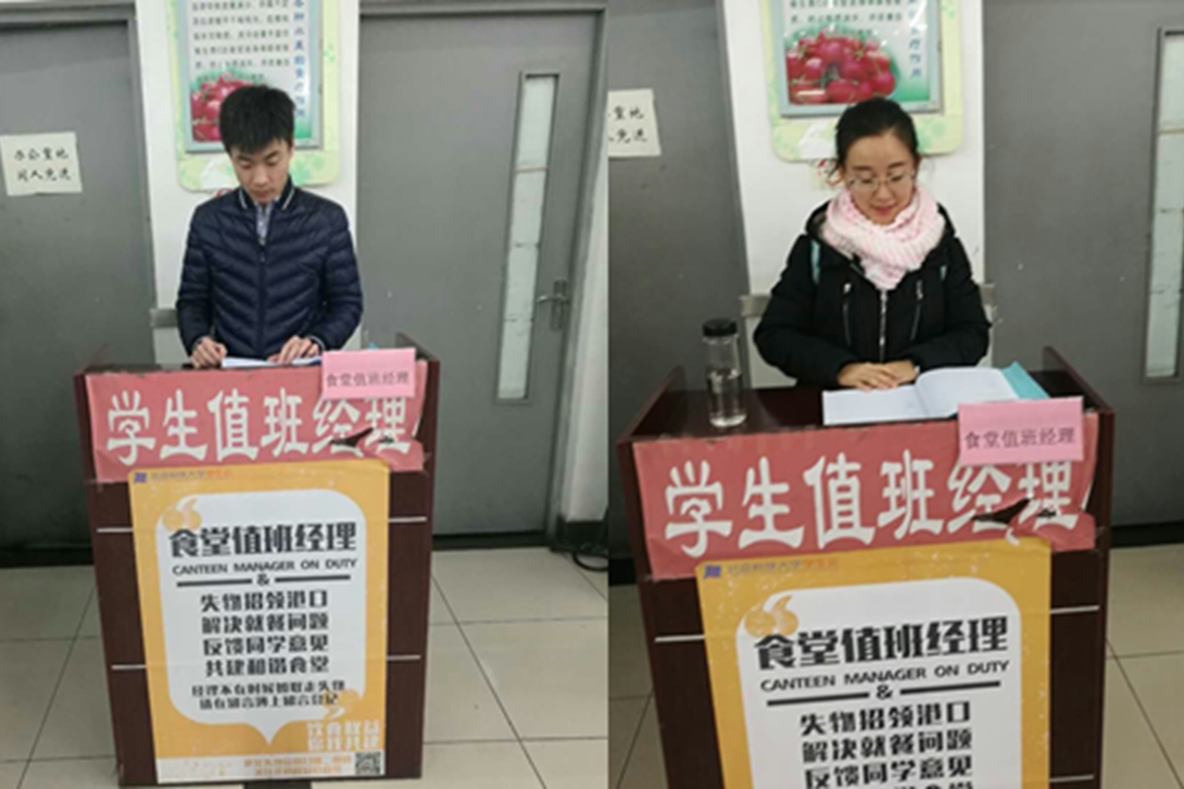 12月4日,冶硕1602班刘慧蓉同学和王晶同学自发利用课余时间在鸿博食堂一楼进行义务值班经理活动。