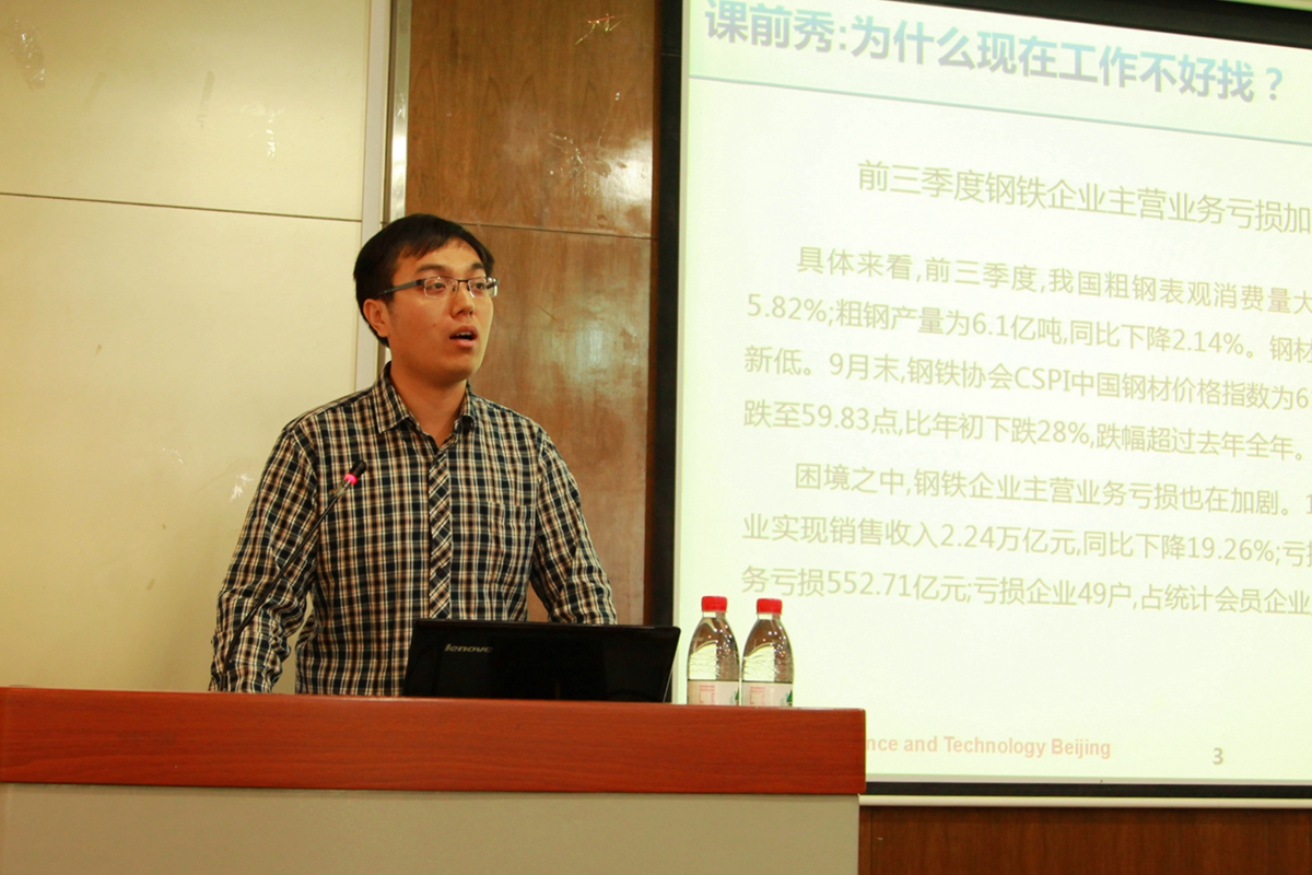 张瑞先生是我校冶金工程专业2015届硕士毕业生。在校期间,张瑞学习科研成绩优异,综合素质突出,曾担任学院研究生会主席,在毕业应聘中获得多个名企工作机会。张瑞先生先后供职于中铁物资集团、中铁十八局集团国际公司,立足钢铁冶金专业,积极拓展职业发展路径。“如何找到一份称心的工作?”张瑞先生首先结合自身应聘经历,强调了明确自身定位、积极把握机会的重要性,指导同学们增强对自身的了解,努力提升个人的应聘能力。张瑞先生以中信泰富、宝钢集团等为案例,介绍了钢铁相关行业企业生产经营的发展趋势,鼓励同学们增强行业自信、专业自信。