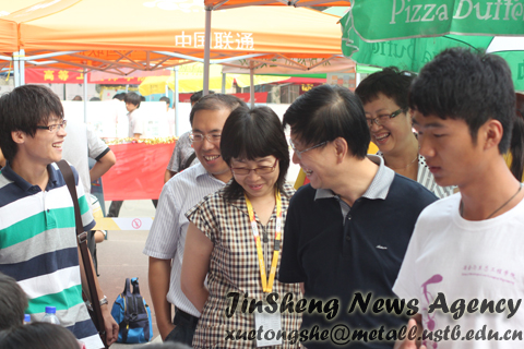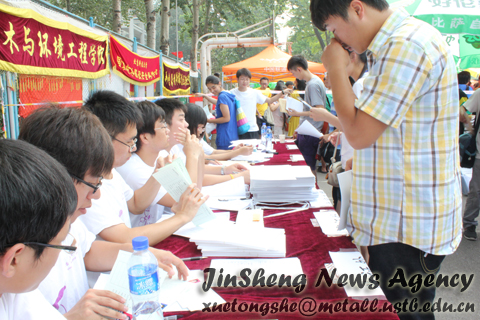 迎接新生活动在篮球场正式展开。院党委副书记王春义老师、院团委常务副书记尹传举老师在现场指导迎新工作,院学生会、金生新闻社和学院先进党员志愿者作为工作人员帮助2011级新生办理入学手续。