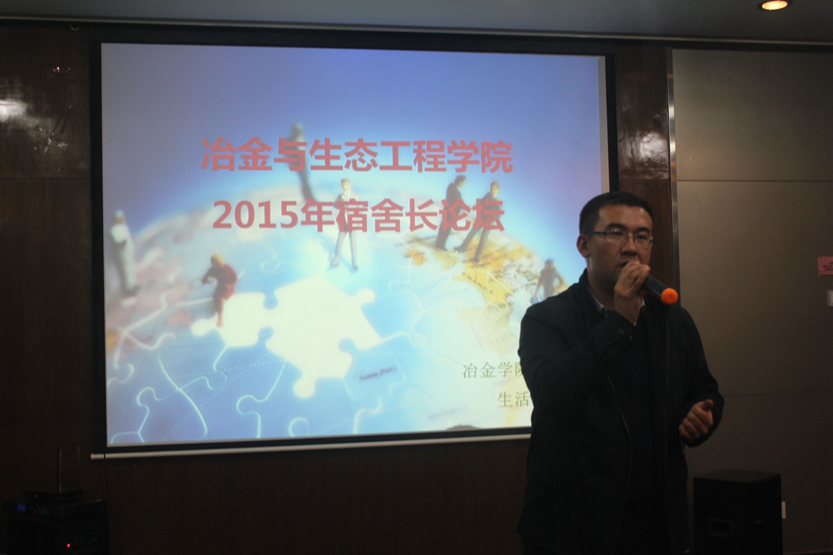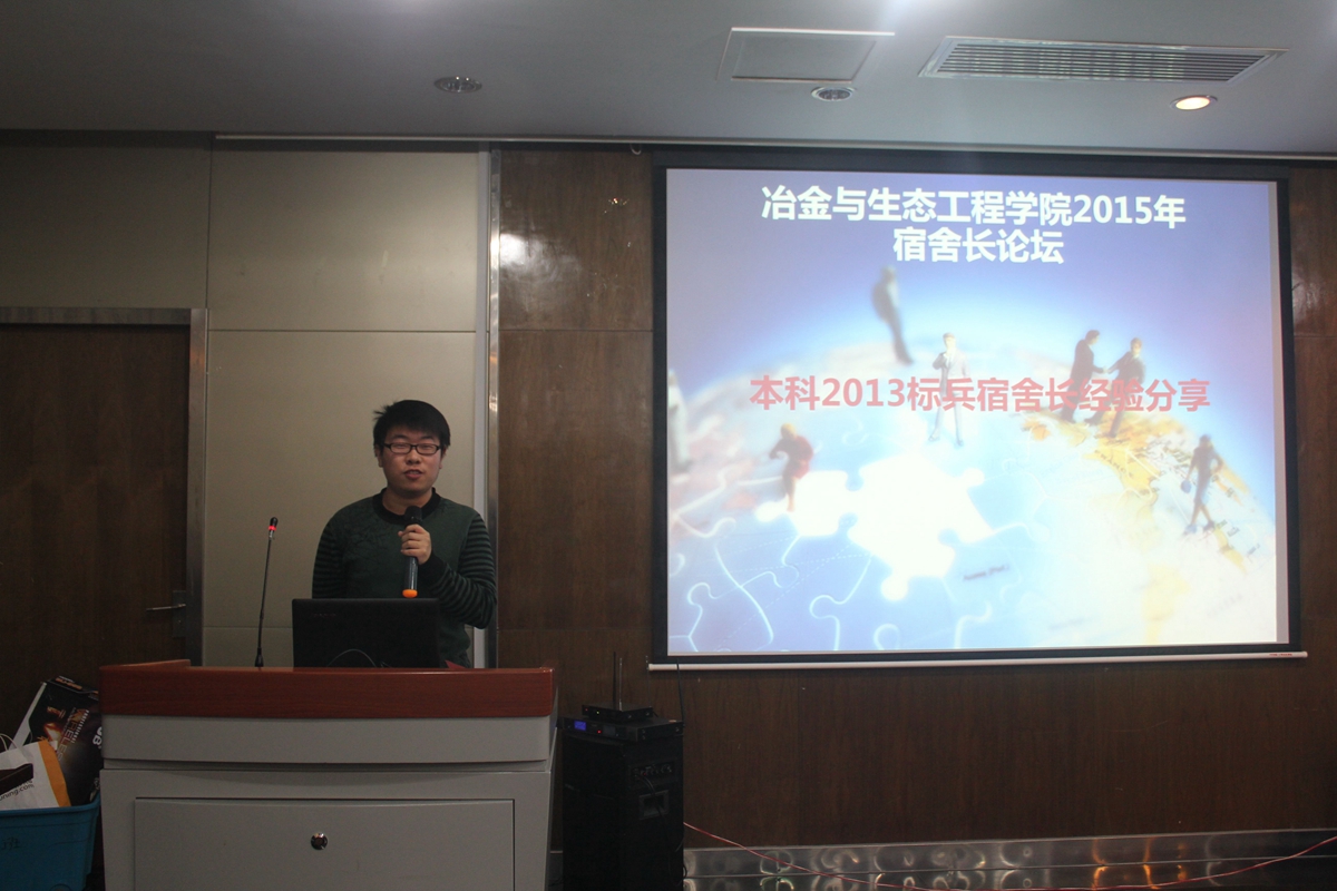 第三届宿舍文化节宿舍长论坛活动在冶金生态楼青钢报告厅举行。学院团委书记杨志伟老师、学院本科2015级辅导员陈曦老师,学院团委学生会主席谢宏亮同学、副主席王路召同学应邀参加论坛活动。本科2015级新生宿舍长以小组为单位,围绕“如何做一名标兵宿舍长”主题进行主题发言,学院本科2013级标兵宿舍长代表与在场同学们分享了标兵宿舍创建经验。