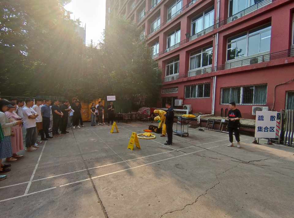 紧接着,全楼消防警报响起,楼道中烟雾弥漫,师生们纷纷捂住口鼻、躬身从楼梯往楼下撤离。短短几分钟内,师生在冶金楼大车间广场完成集合,准备观看危险废弃物泄露演习。