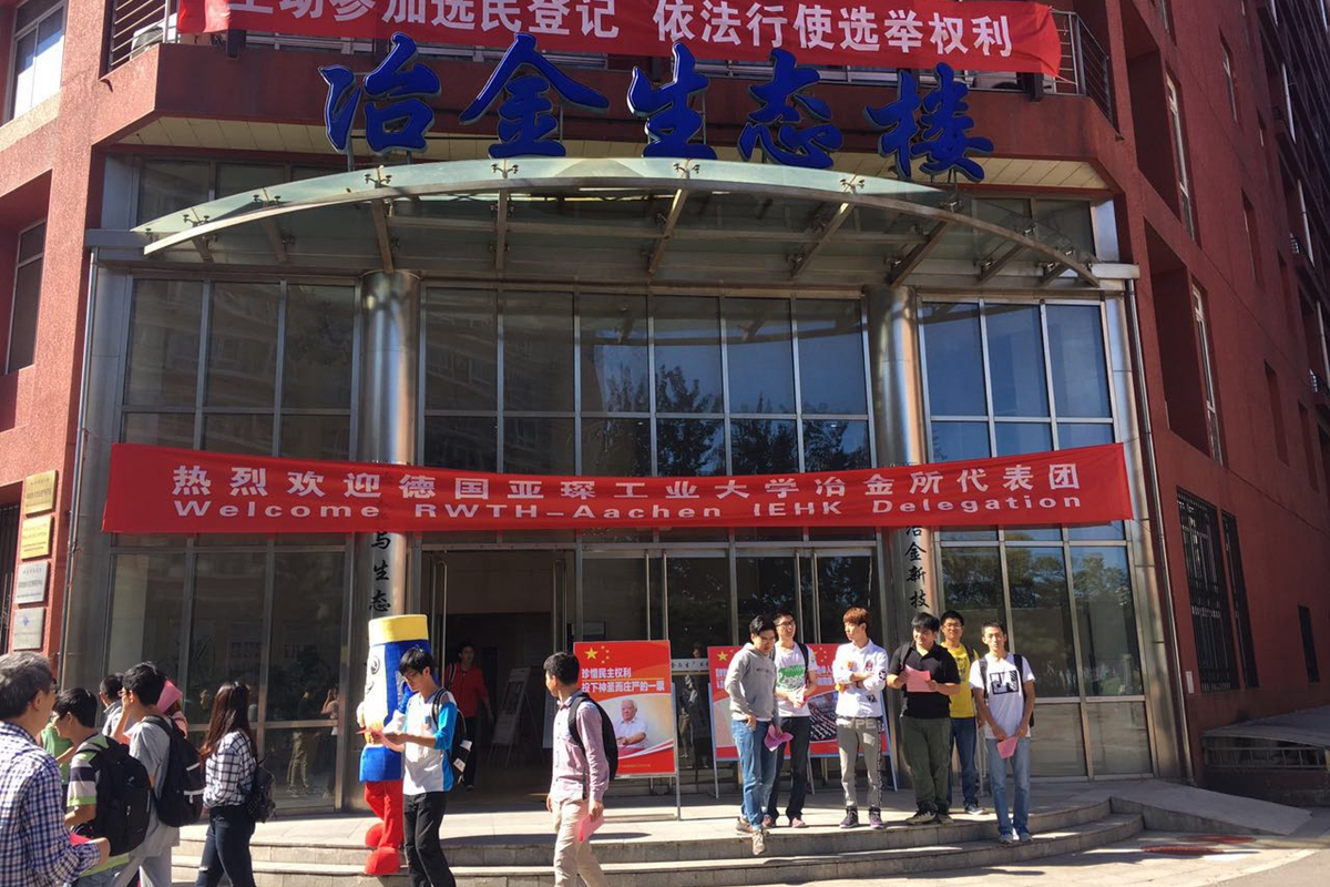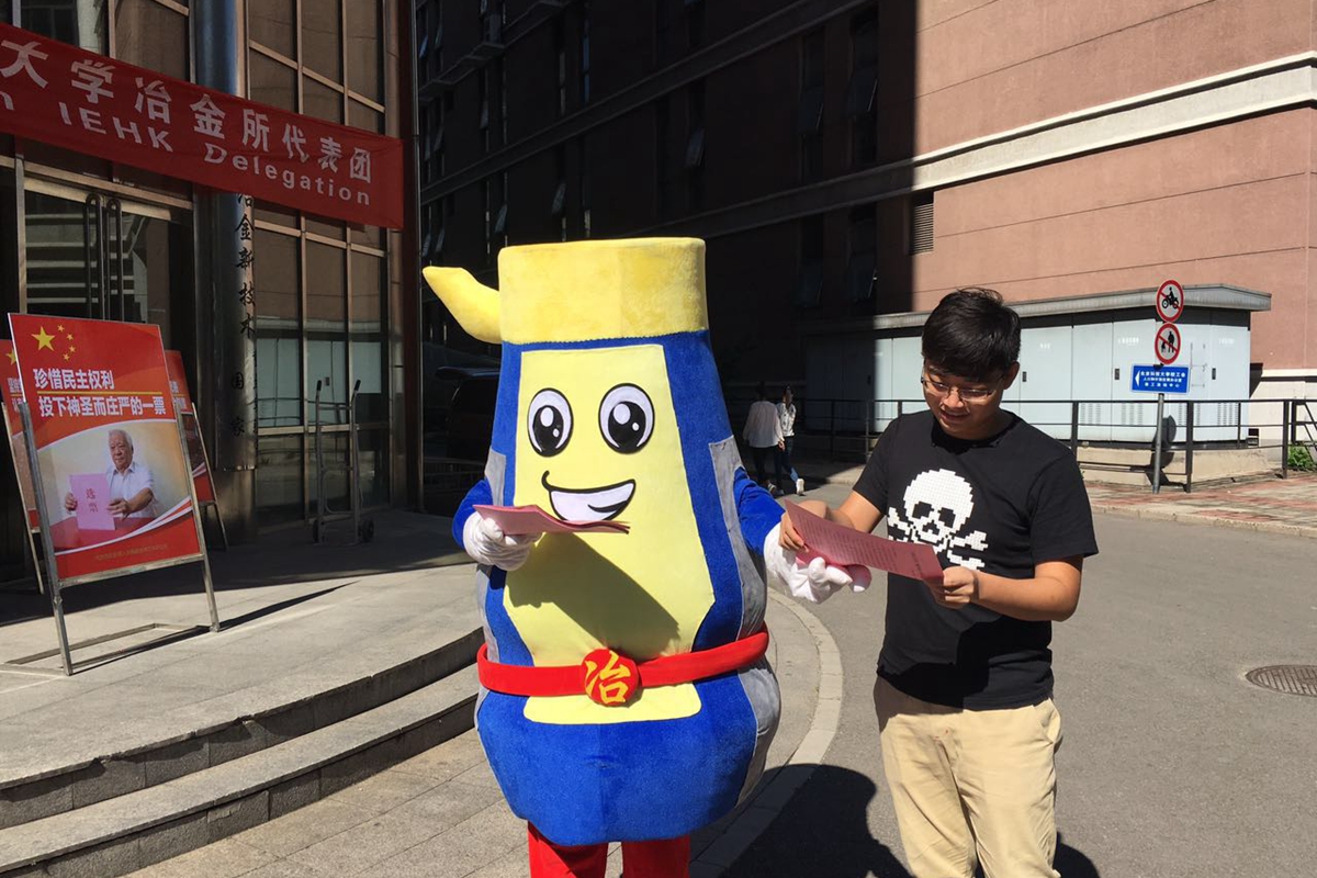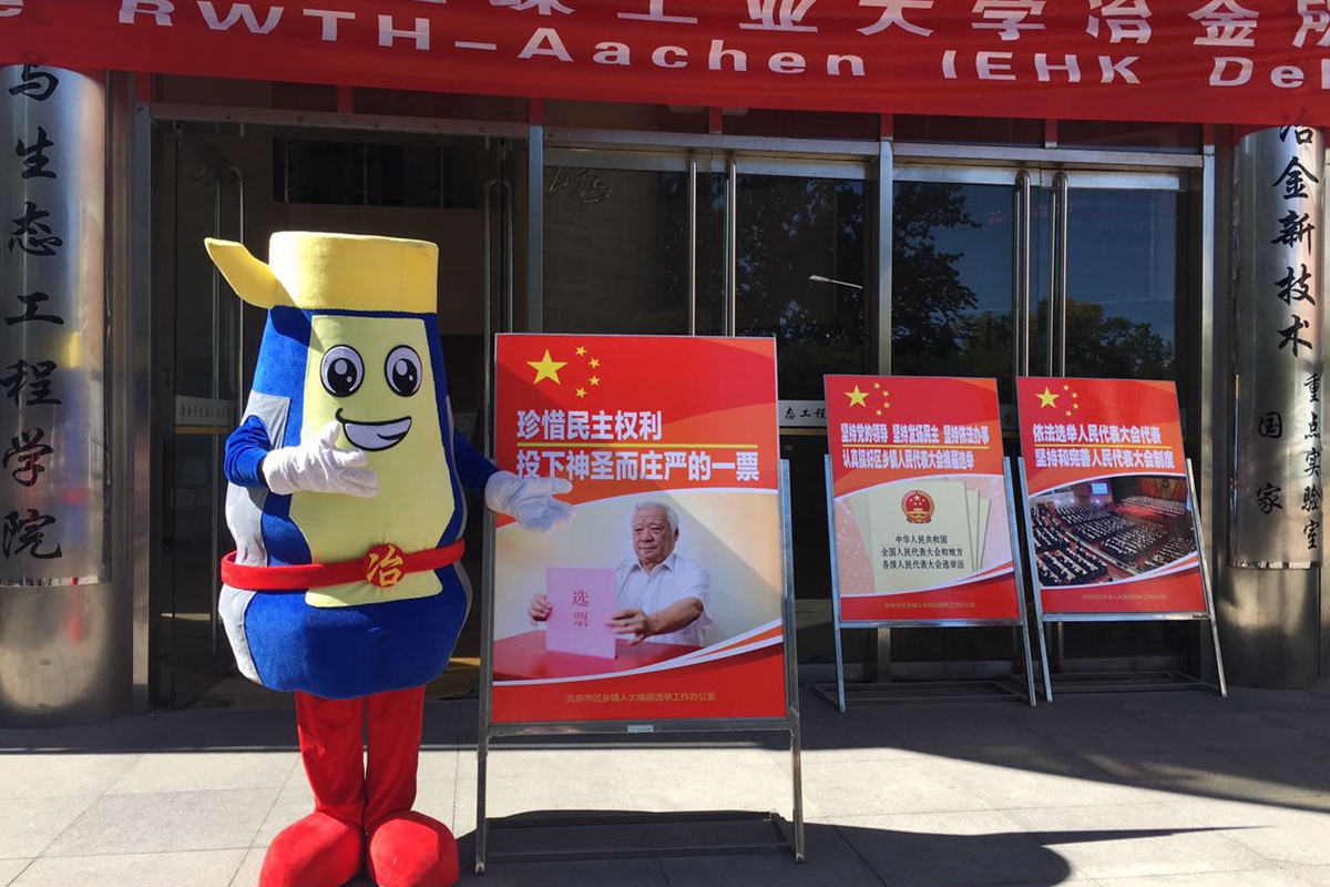 在冶金生态楼门前设置了宣传站点,学院机关党支部党员教师对广大师生进行了人大代表换届选举知识的普及工作。