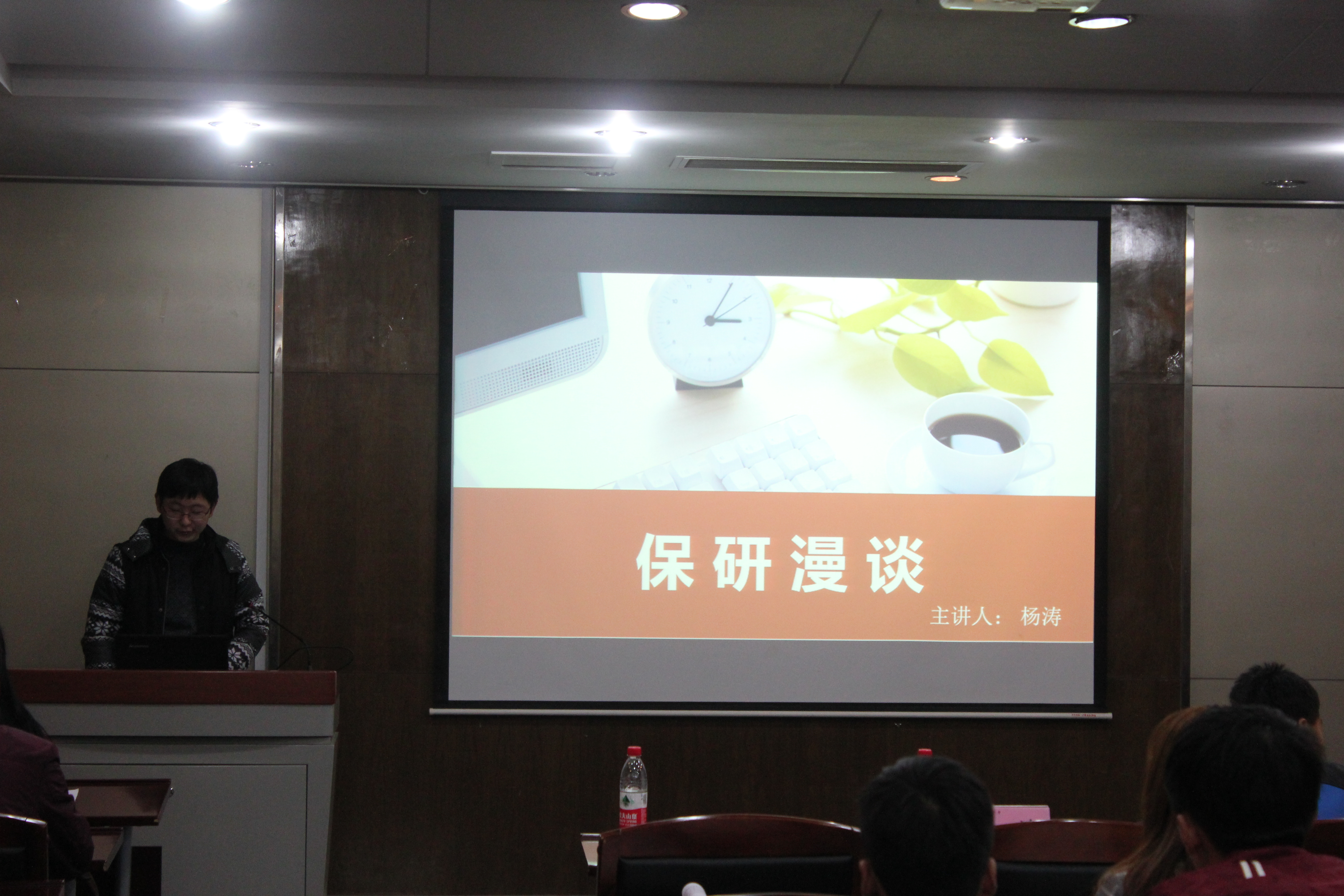 本次交流会主要分为两个环节:首先,杨涛学长分享了他自己保研过程中的一些个人经历,并着重介绍了保研的一些具体流程,强调了申请保研的一些技巧和注意事项;之后进行了2013级学生与学长面对面互动问答环节。在此期间,2013级学生积极向学长们请教了自己对保研准备工作的一些疑惑并得到了学长们的认真解答。