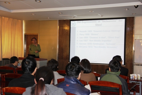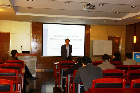 具有半年以上海外经历的青年教师为大家做报告,交流在学习、科研和工作等方面的经验。此次讲座特别邀请张立峰教授为大家做了题为“Fundamentals of Non-Metallic Inclusion in Steel(非金属夹杂物的研究)”的报告,希望能为各位老师作表率,加强大家在科研方面的经验交流。在报告中,张教授首先追溯了“Inclusion(夹杂物)”名称的起源及演变,随后结合自己的研究对夹杂物的形态、形成原因、处理方法、在生产过程中的变化及其对产品的影响等作了精彩的论述,并对该问题的学术前沿进行了追踪探讨。报告结束后,在场的各位老师就自己关心的问题与张教授进行了热烈的讨论。随后,陈骏、郭敏、焦树强、胡晓军、闫柏军、束奇峰、侯新梅等7位青年教师就自己在国外的课题研究及工作学习生活的情况作了精彩的演讲。每场演讲后,听众们都会结合自己的研究情况和经验与演讲人进行活跃的交流。