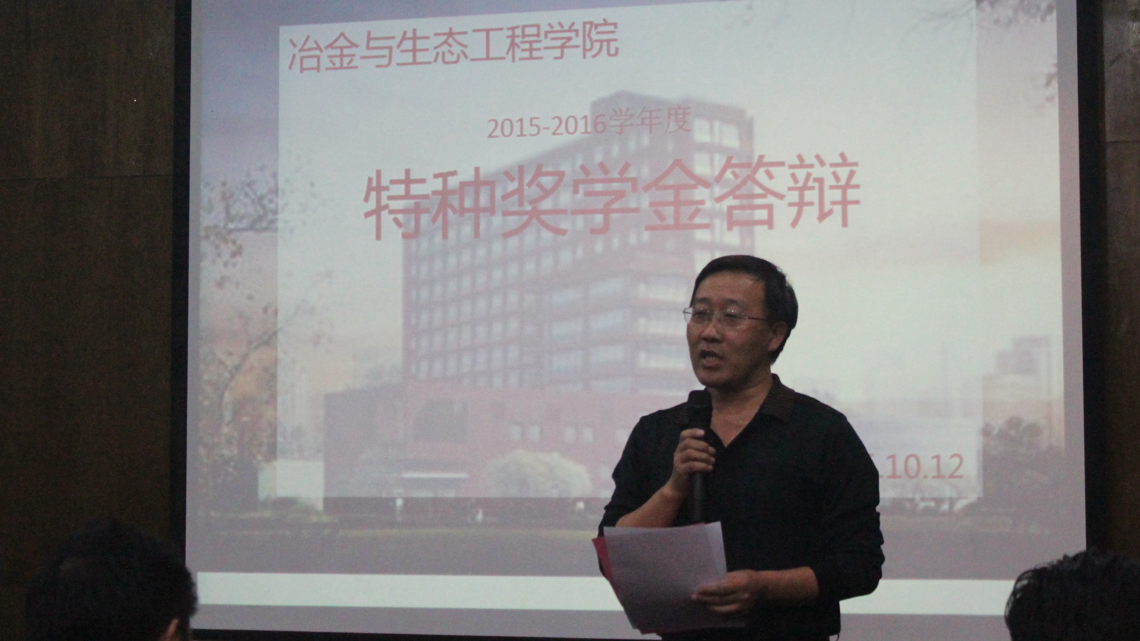 2014-2015学年本科生特种奖学金答辩会在冶金生态楼青钢报告厅隆重举行。来自本科2012、2013和2014级的12名优秀学子进行特种奖学金答辩。学院党委副书记兼副院长王春义老师、冶金1307班班导师马瑞新老师、冶金1407班班导师曹战民老师、钢铁冶金系王广伟老师、学院团委书记杨志伟老师及本科各年级辅导员担任答辩评委。本科2015级百余名学生现场观摩了答辩。