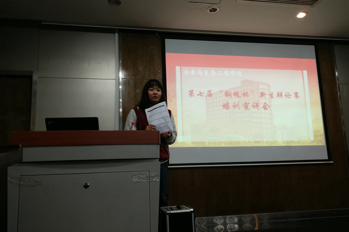 10月16日晚,云顶集团(中国)唯一官方网站 第七届“钢魂杯”新生辩论赛培训宣讲会在冶金楼青钢报告厅顺利召开。本次培训宣讲会由冶金1502班王甜雨同学主持,校立言辩论队队长樊婧同学、副队长张静远同学、程婉婷同学对参赛者进行了关于辩论赛的准备工作、辩论技巧和答辩礼仪等方面的培训。