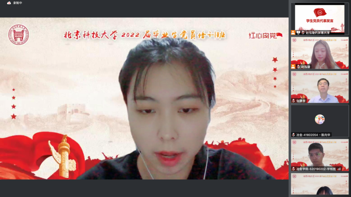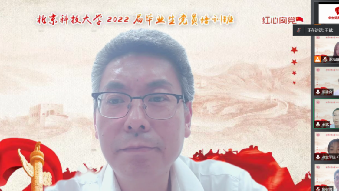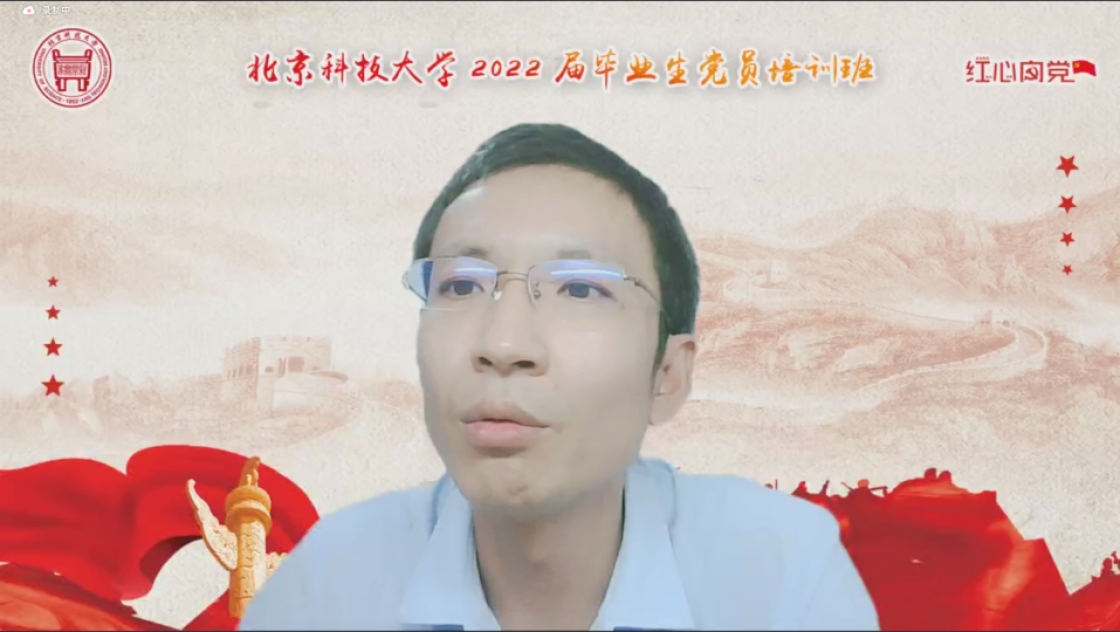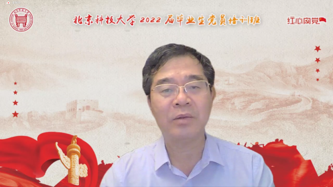 张建良以“不忘百年路,启航新征程”为主题进行党课讲授。他指出,疫情防控关键之时,年轻一代党员同志冲锋在前,让红色的党旗在疫情防控工作的志愿蓝中高高飘扬,充分彰显了新时代青年不遗余力在担当中作为,在磨砺中成长。他从习近平总书记给北京科技大学15位老教授们的回信精神出发,对毕业生党员提出三点希望,一是要坚定信念,志存高远,党员同志们要始终坚守初心,为民族复兴、国家富强无私奉献、无畏向前;二是要明德修身,勇担责任,毕业生党员们要以钢铁报国为己任,努力成为铸就科技强国、制造强国的钢铁脊梁;三是要奋勇争先,勤于实践,站在人生的新起点,冶金学子们带着北科赋予的印记,心怀憧憬,满怀感激,练就过硬本领,在祖国的大江南北建功立业,光荣的喊出“请党放心,强国有我”的铮铮誓言。